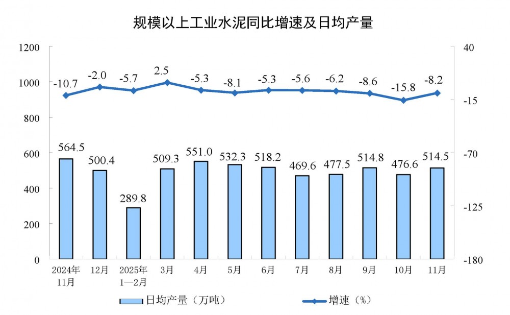 國家統(tǒng)計局數據顯示,2025年11月份,全國規(guī)上工業(yè)水泥產量15434萬噸,同比下降8.2%;2025年1-11月份,全國規(guī)上工業(yè)水泥產量154883萬噸,同比下降6.9%。
